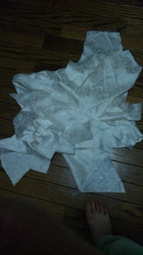 地模様のある白チャイナを裁断します。型紙に合わせて大体で。